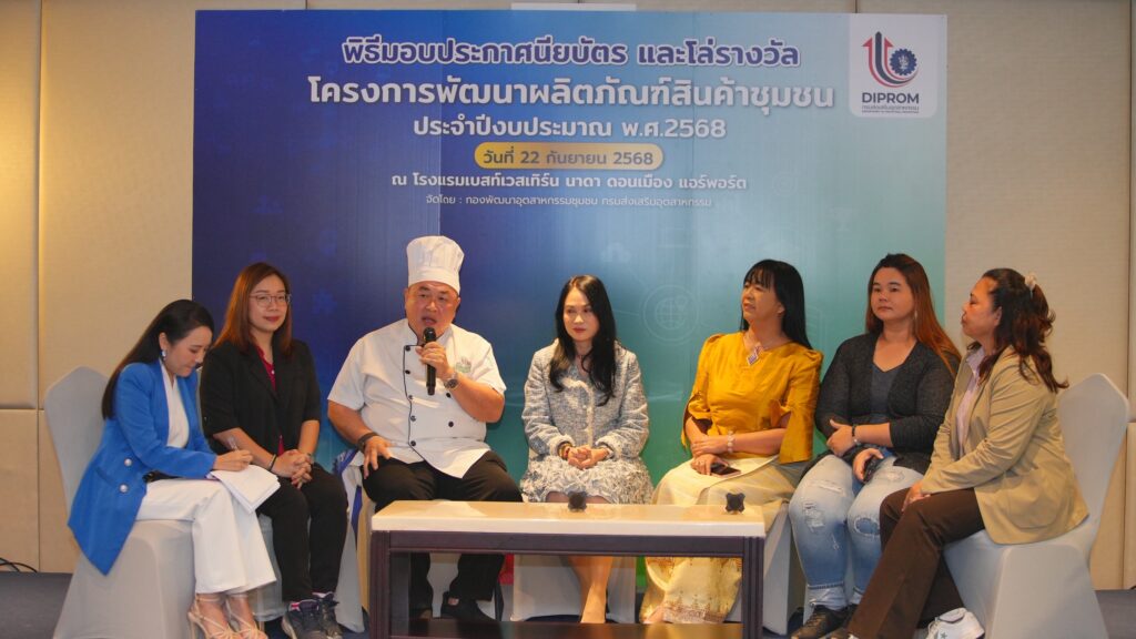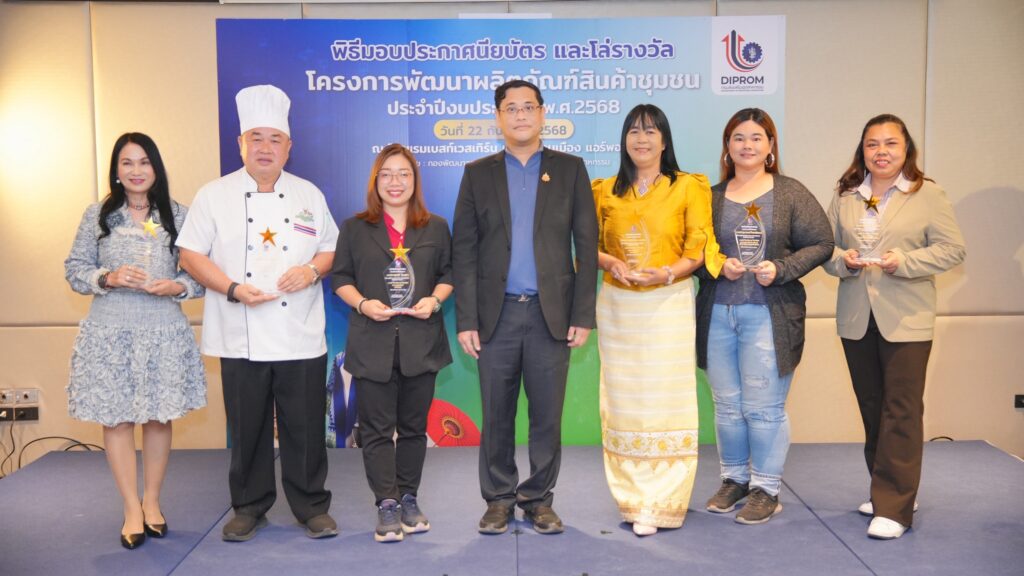 กองพัฒนาอุตสาหกรรมชุมชน กรมส่งเสริมอุตสาหกรรม โดย ดร.พลาวุธ วงศ์วิวัฒน์ ผู้อำนวยการกองพัฒนาอุตสาหกรรมชุมชน เป็นประธานมอบประกาศนียบัตรและโล่รางวัลแก่ผู้ประกอบการดีเด่น จำนวน 6 สาขา ที่ผ่านการคัดเลือก ภายใต้โครงการพัฒนาผลิตภัณฑ์สินค้าชุมชน กับกิจกรรม “DIPROM : Pitching Bootcamp 2568 พลิกเกมธุรกิจชุมชน สู่ตลาดยุคใหม่” และยังพัฒนาผลิตภัณฑ์ใหม่และต้นแบบมากกว่า 250 ผลิตภัณฑ์ ด้วยหลักสูตรเข้มตลอด 4 วันเต็ม กับองค์ความรู้เชิงลึกครบเครื่อง เสริมศักยภาพผลิตภัณฑ์ชุมชนไทยให้ยกระดับพร้อมเติบโตไกล ณ โรงแรมเบสท์เวสเทิร์น นาดา ดอนเมืองแอร์พอร์ต ทั้งนี้กรมส่งเสริมอุตสาหกรรมตั้งเป้าเดินสายอบรม 4 ภูมิภาคทั่วประเทศ รวมทั้งสิ้น 1,000 กิจการ